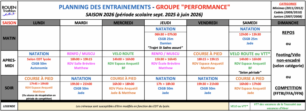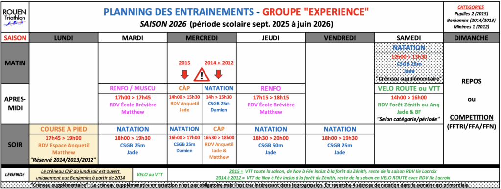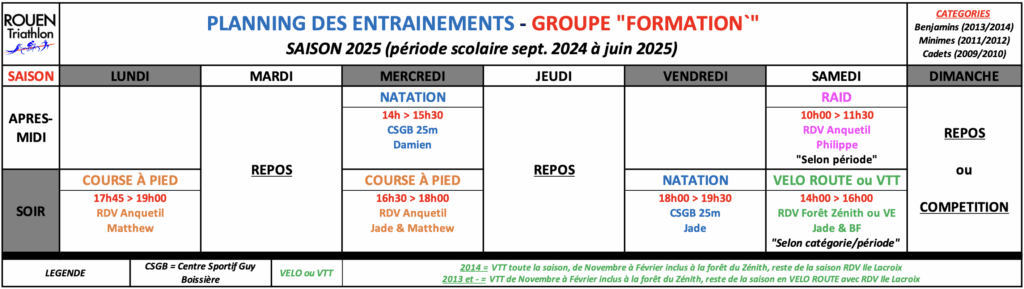Afin que tous les enfants puissent s’épanouir dans la pratique du Triathlon, les entraînements de l’école de Triathlon sont adaptés aux capacités physiques de chaque catégorie d’âge. Les créneaux sont donc spécifiques à chaque tranche d’âge.